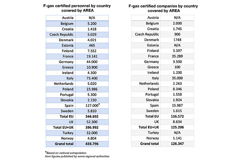The figures come from a new survey amongst AREA member organisations looking at F-gas certification and training amongst the 344,692 F-gas certified refrigeration, air conditioning and heat pump personnel in the 18 EU countries covered by AREA membership, 52,300 in the UK, 32,000 in Turkey and 4,804 in Norway.