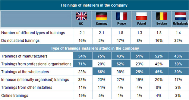 Showing large differences across the six European states, the survey reveals that while around 98% of German installers attend regular training sessions, only 68% of Dutch installers attend training.