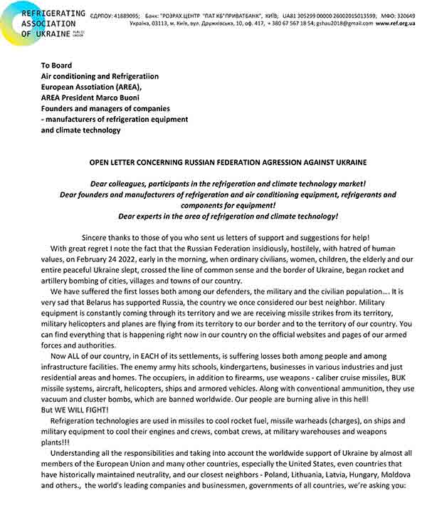 With the worldwide sanctions growing in condemnation of Russia’s invasion of Ukraine, Serhii Anashkin, chairman of the Ukraine Refrigeration Association has written to European association AREA thanking those who have sent Ukraine letters of support and offers of help.
