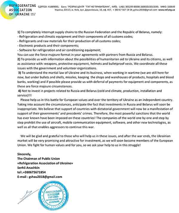 UKRAINE: The Refrigeration Association of Ukraine has called on European refrigeration and air conditioning companies to cease the supply of equipment to Russia and Belarus.