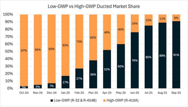 According to the latest Unitary Market Intelligence Report from HARDI, the US HVACR distributors association, low-GWP A2L equipment accounted for 91% of their sales in September 2025. This caps a year long acceleration that began with single-digit adoption at the end of 2024.