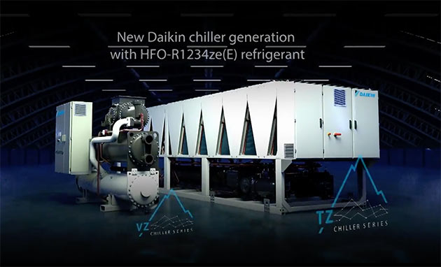 5th November 2017UK: Daikin’s introduction of R1234ze chillers appears to be imminent with the release of a video hailing the launch of air-cooled and water-cooled units using the low GWP HFO refrigerant.